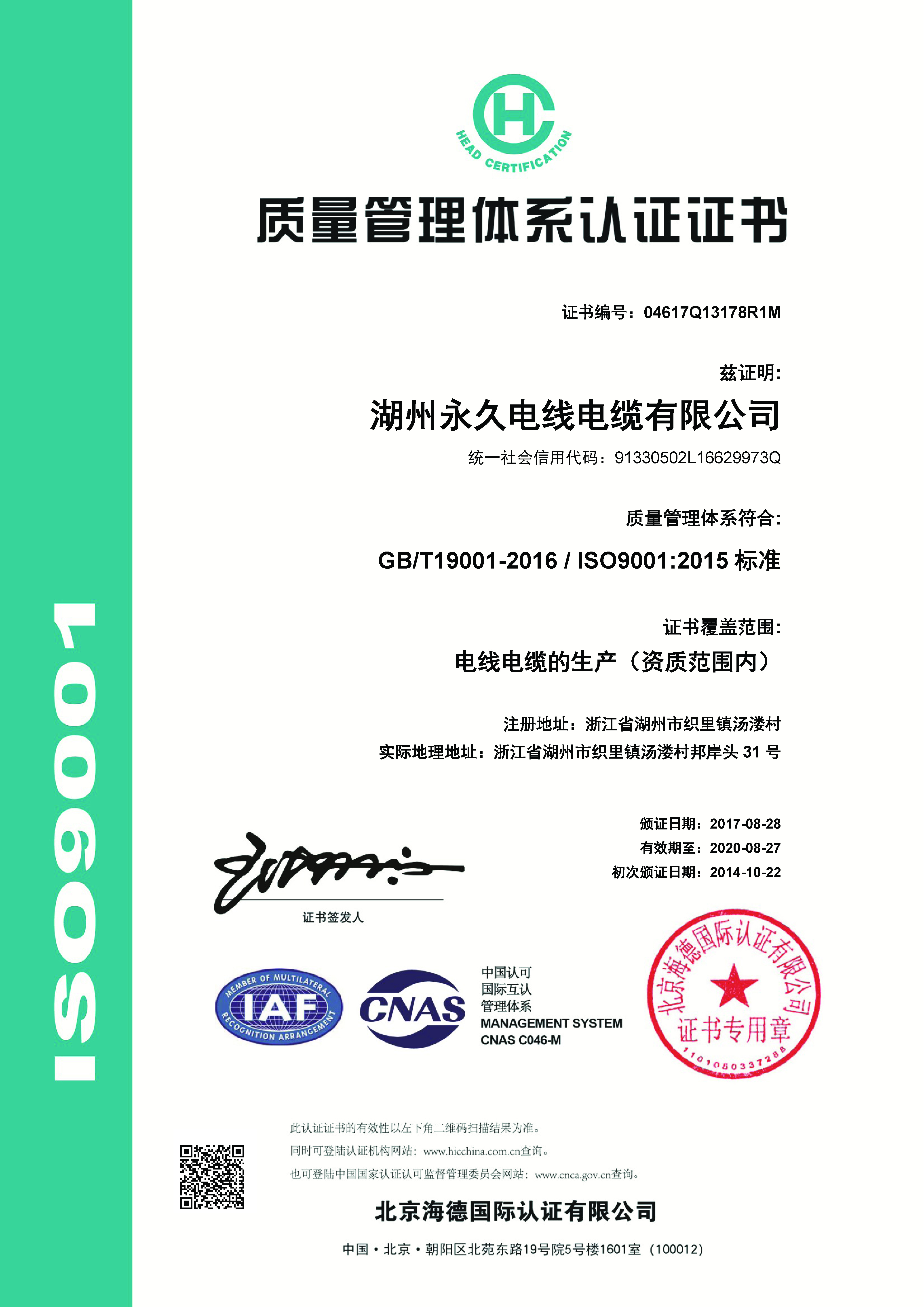 2014年級獲得ISO9001證書, 并獲得湖州名牌產(chǎn)品--“久永” 2015年, “久永”商標獲著名商標的榮譽稱號