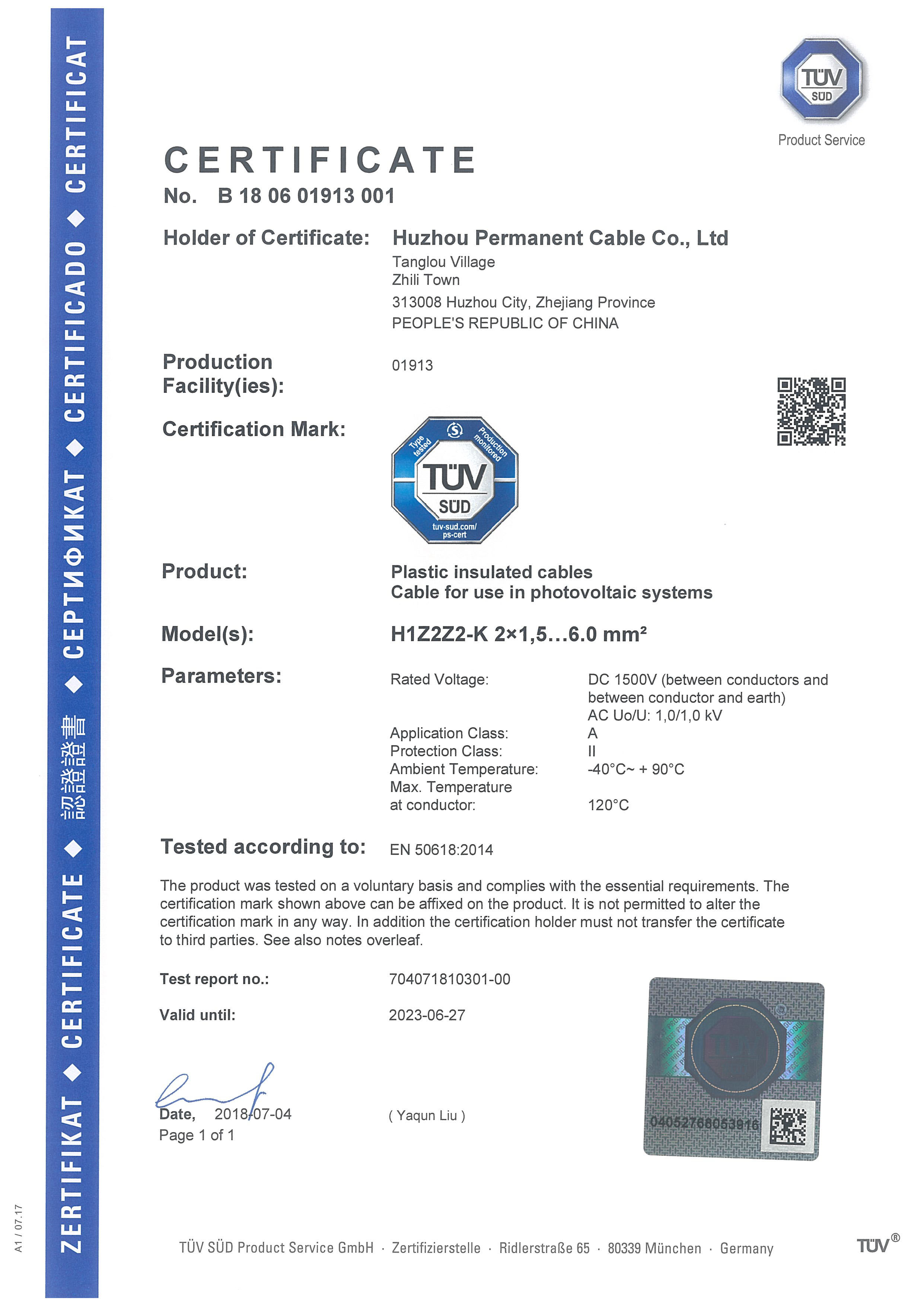 2016年--2018年,我司先后獲得了CE證書和TUV證書, 通過了SGS的第三方驗廠。2017年-2018年,2年的時間內(nèi),在新能源領(lǐng)域--光伏電纜, 取得了重大進步。